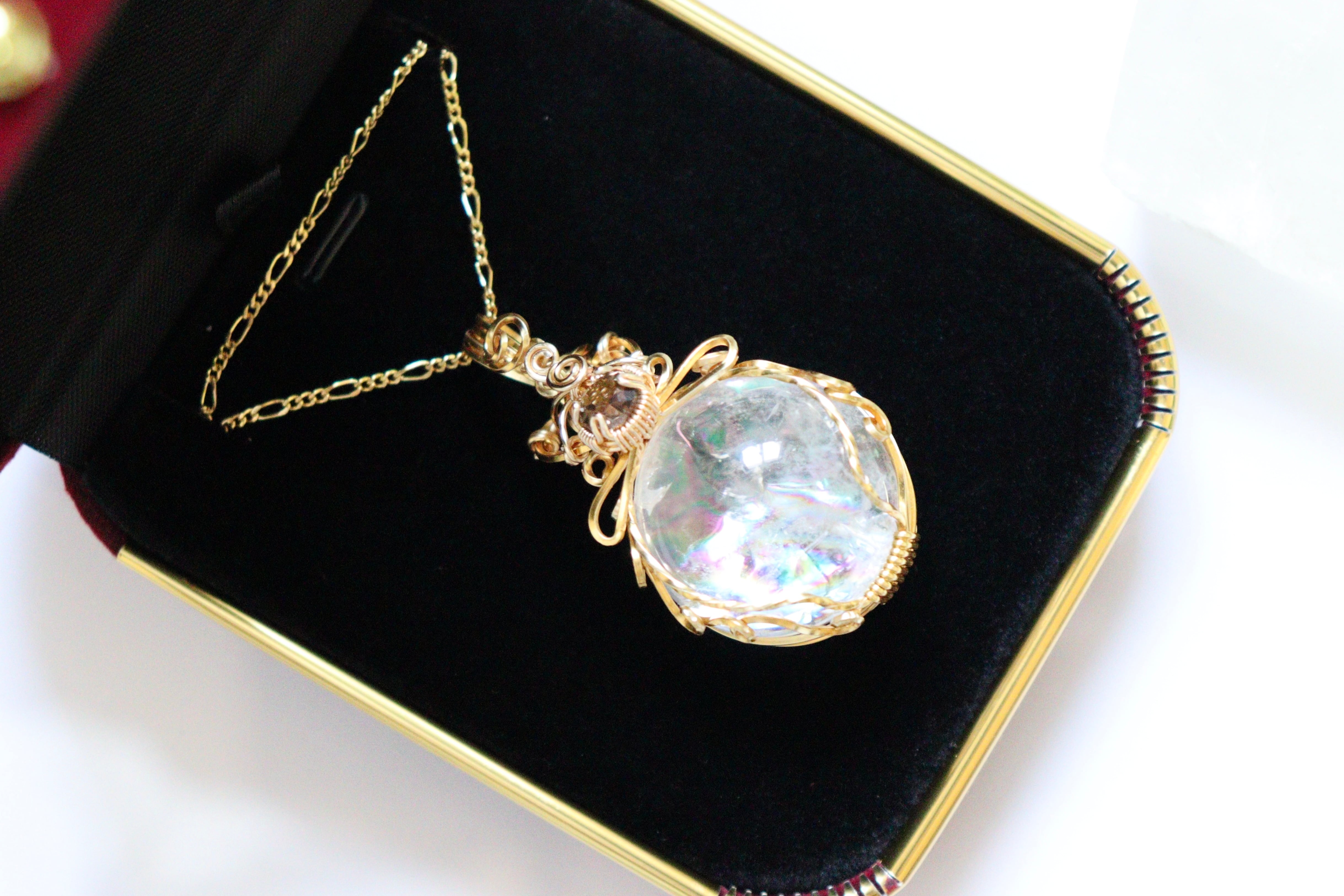 こちらの使用した大粒のアイリスクォーツは、レインボークォーツとも呼ばれていて、沢山の虹も内包されており、キラキラとした輝きが特徴的な水晶です。