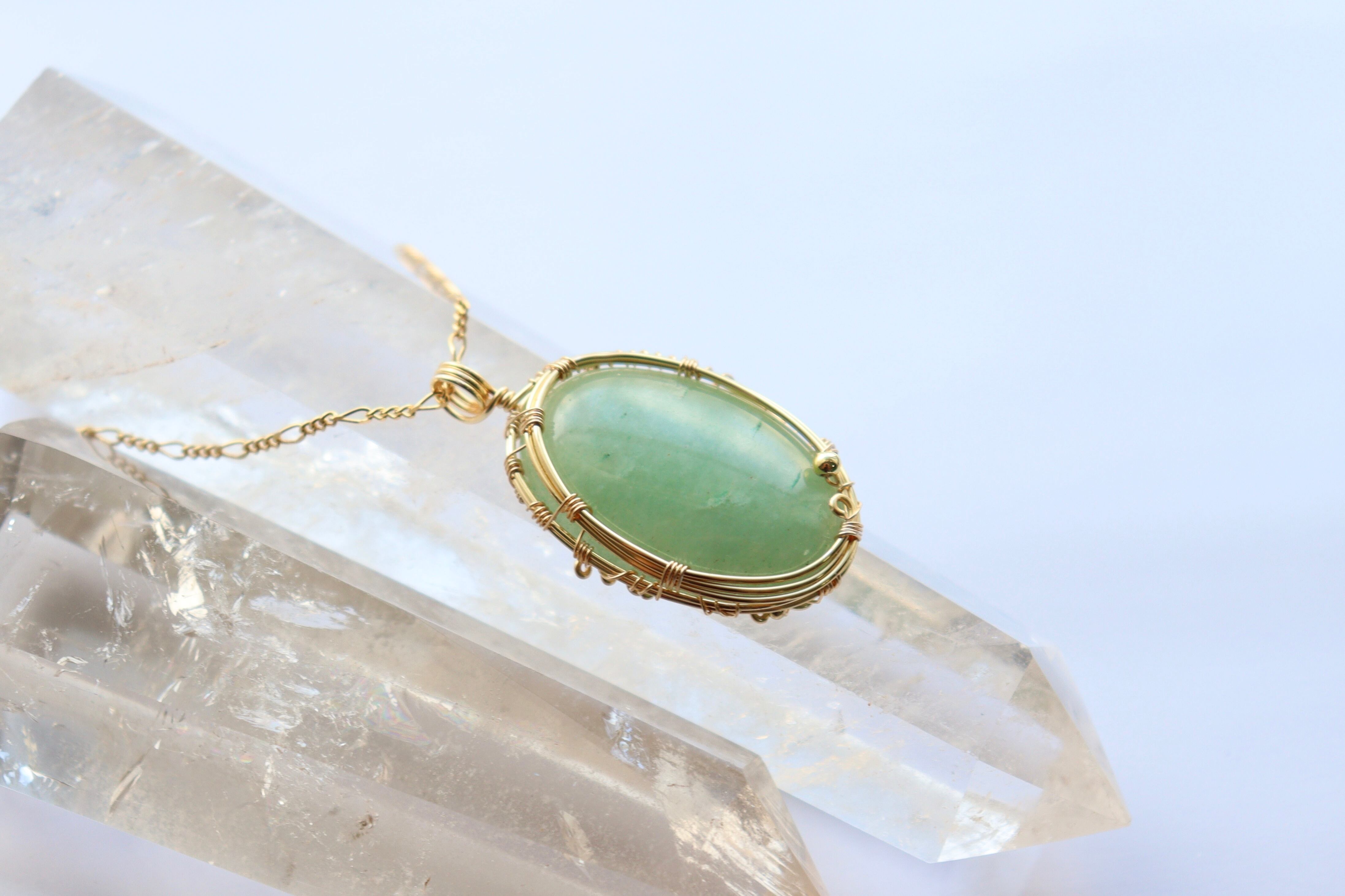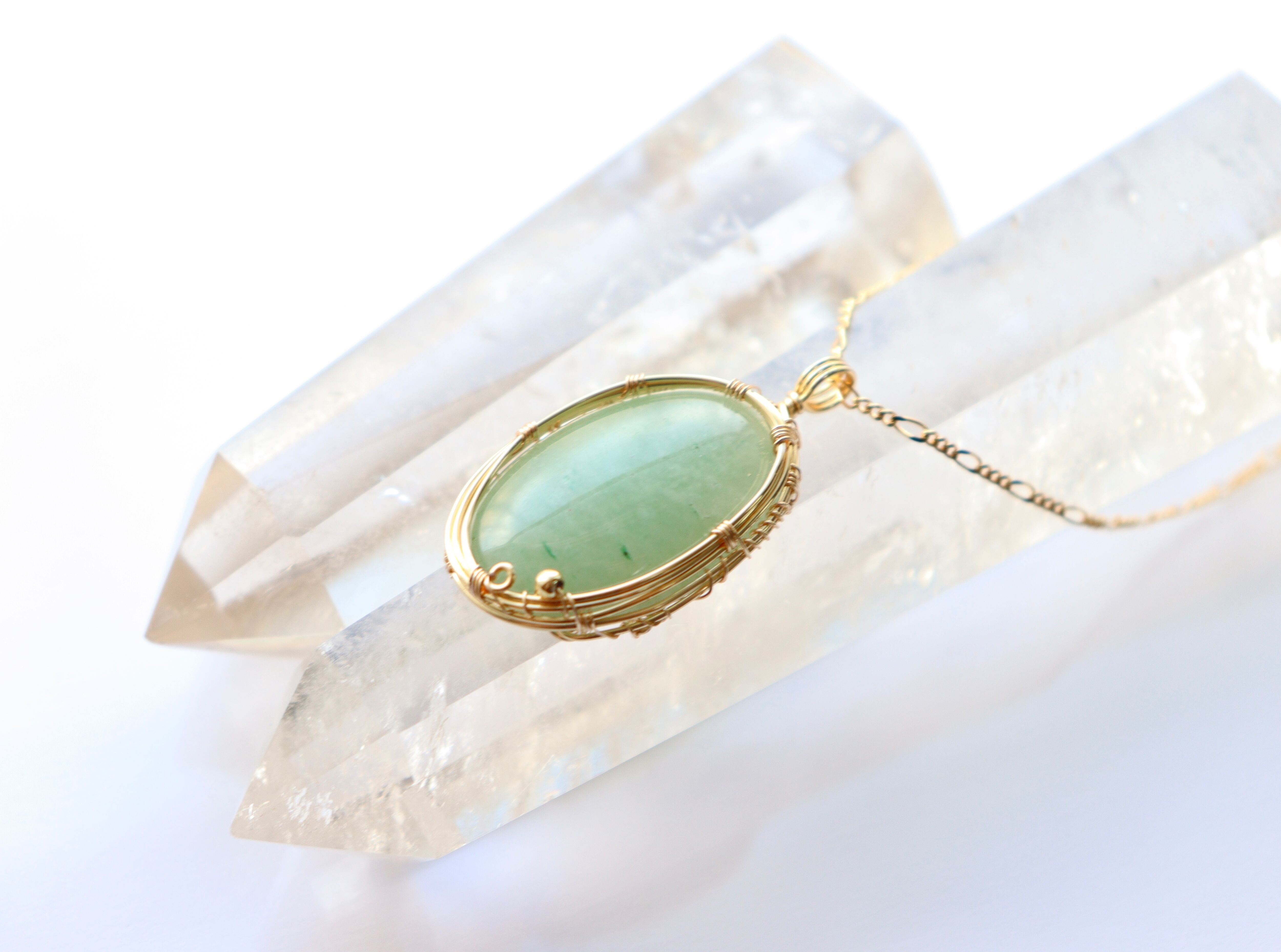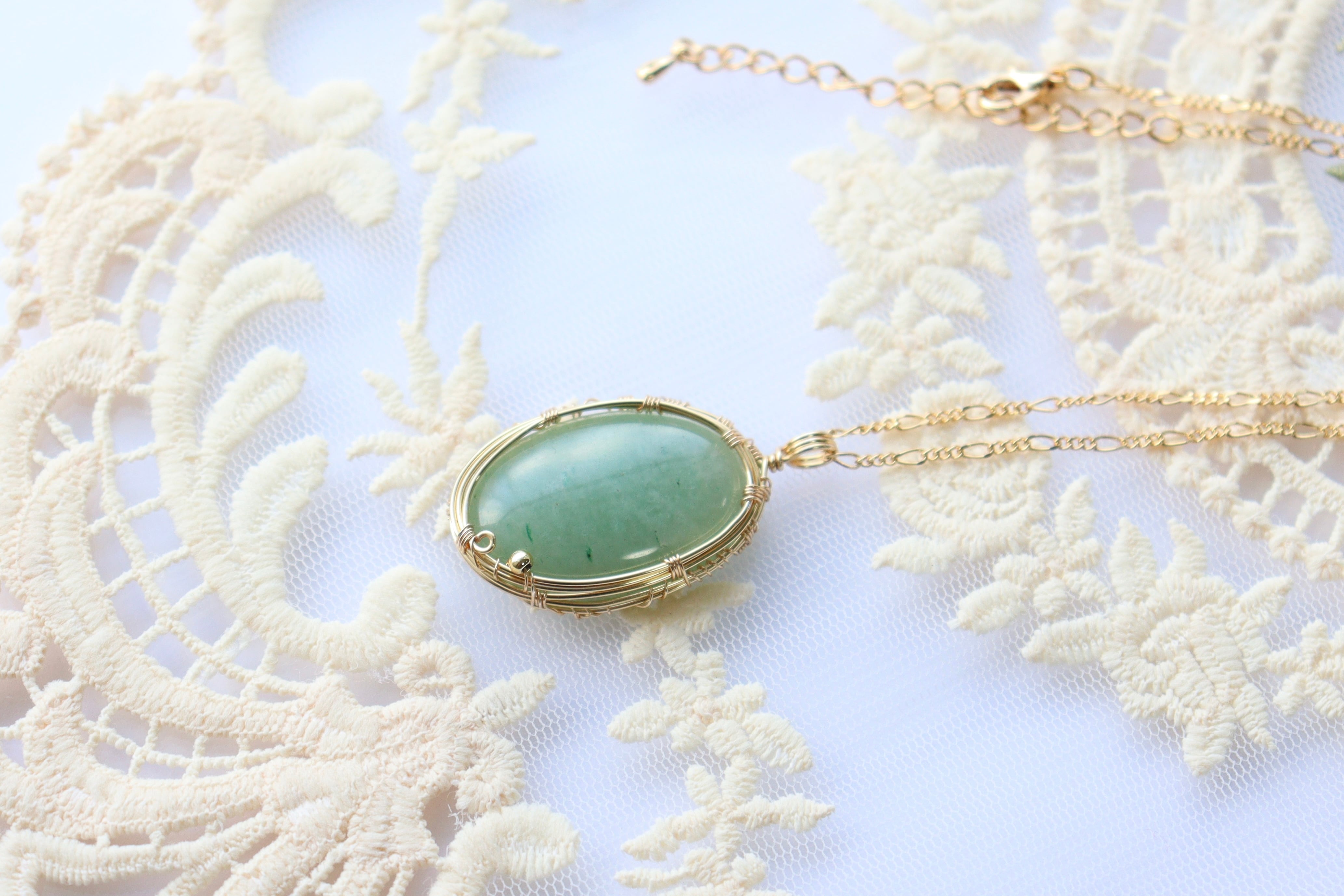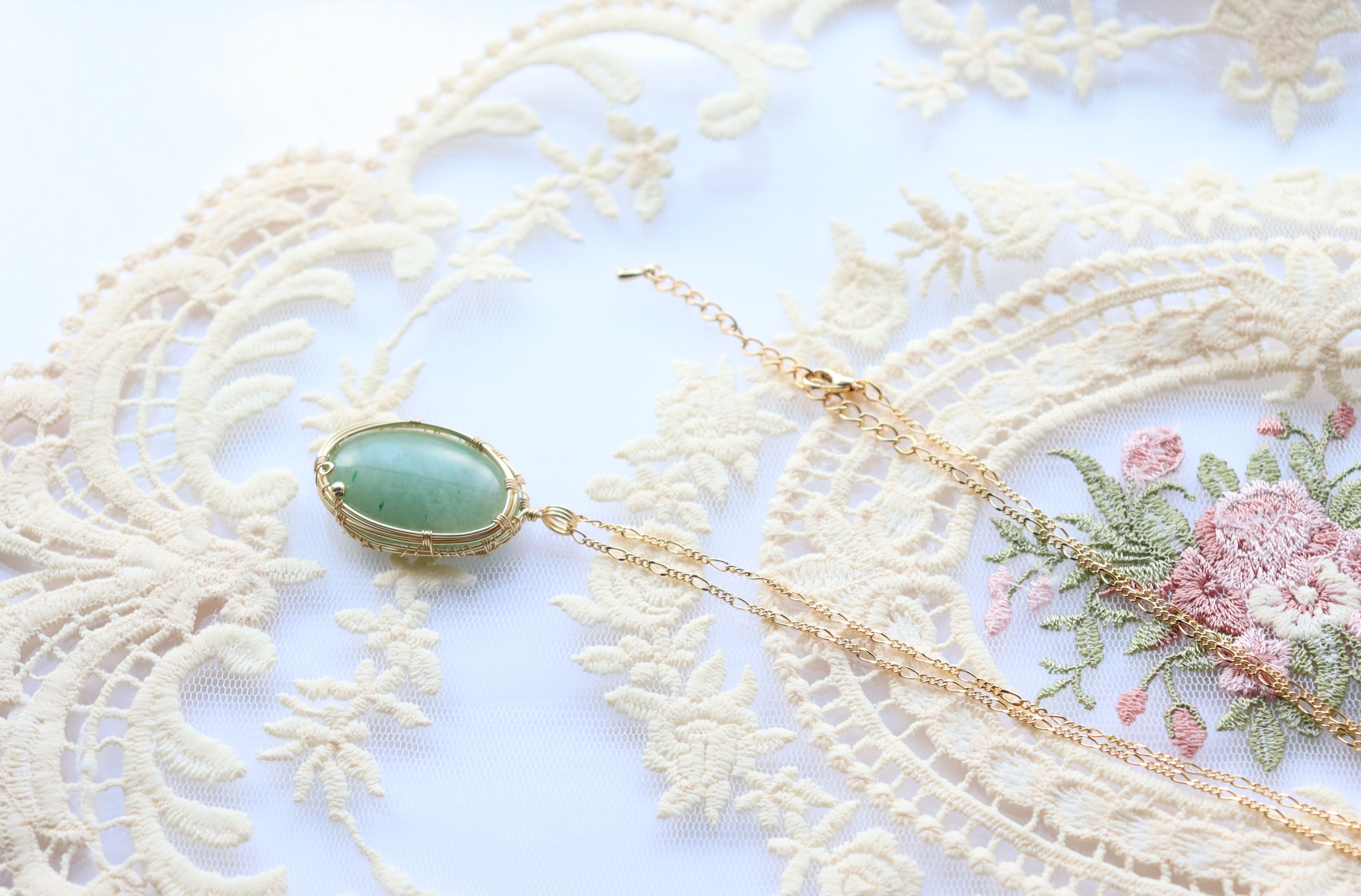 穏やかで優しいグリーンカラーの天然石「アベンチュリン」を使用し、ワイヤーワークで丁寧にワイヤージュエリーネックレスにお仕立て致しました。
