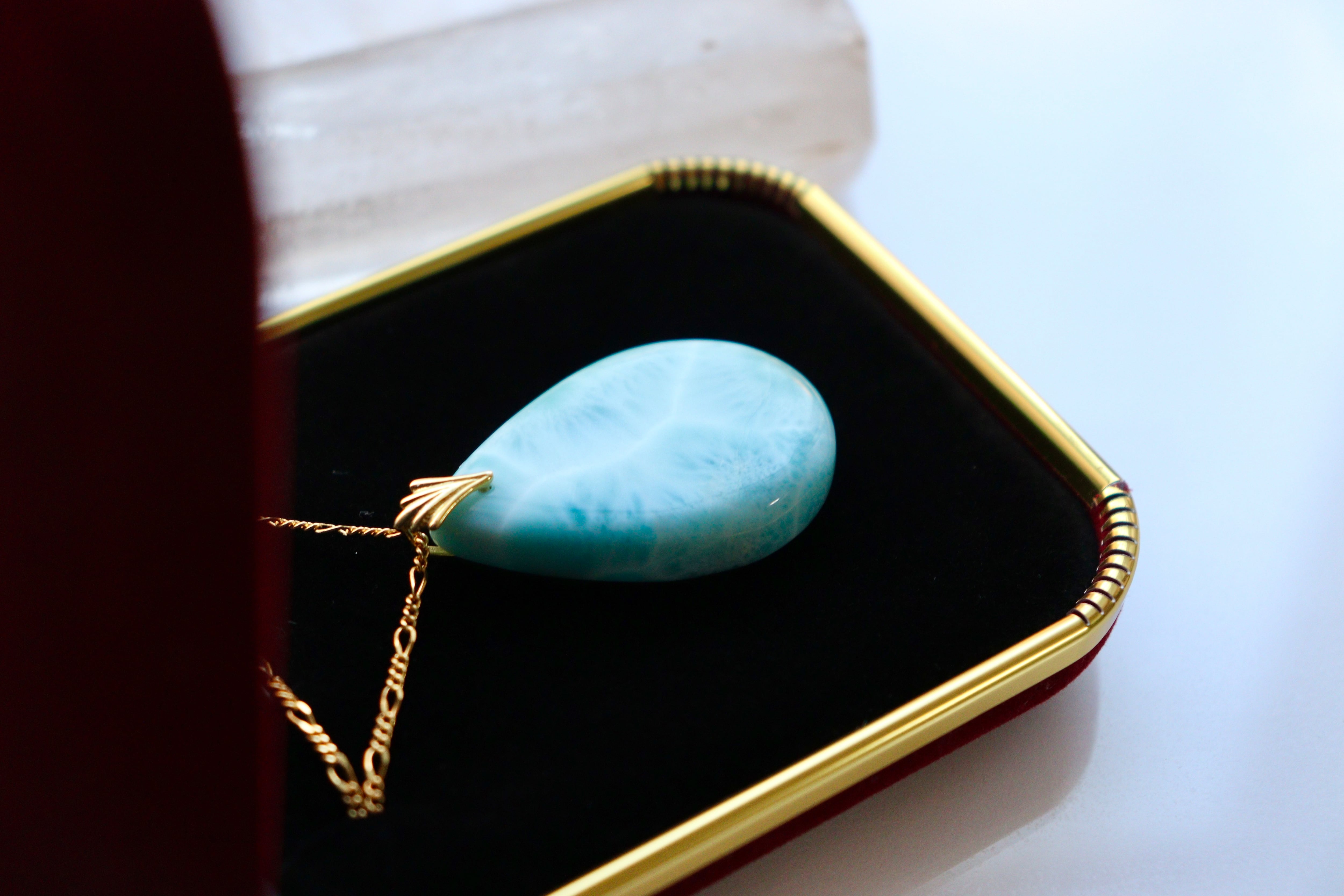 希少石ドミニカ共和国産の高品質な大粒ラリマーを使用して、シンプルなデザインの1粒ネックレスにお仕立て致しました︎︎⟡