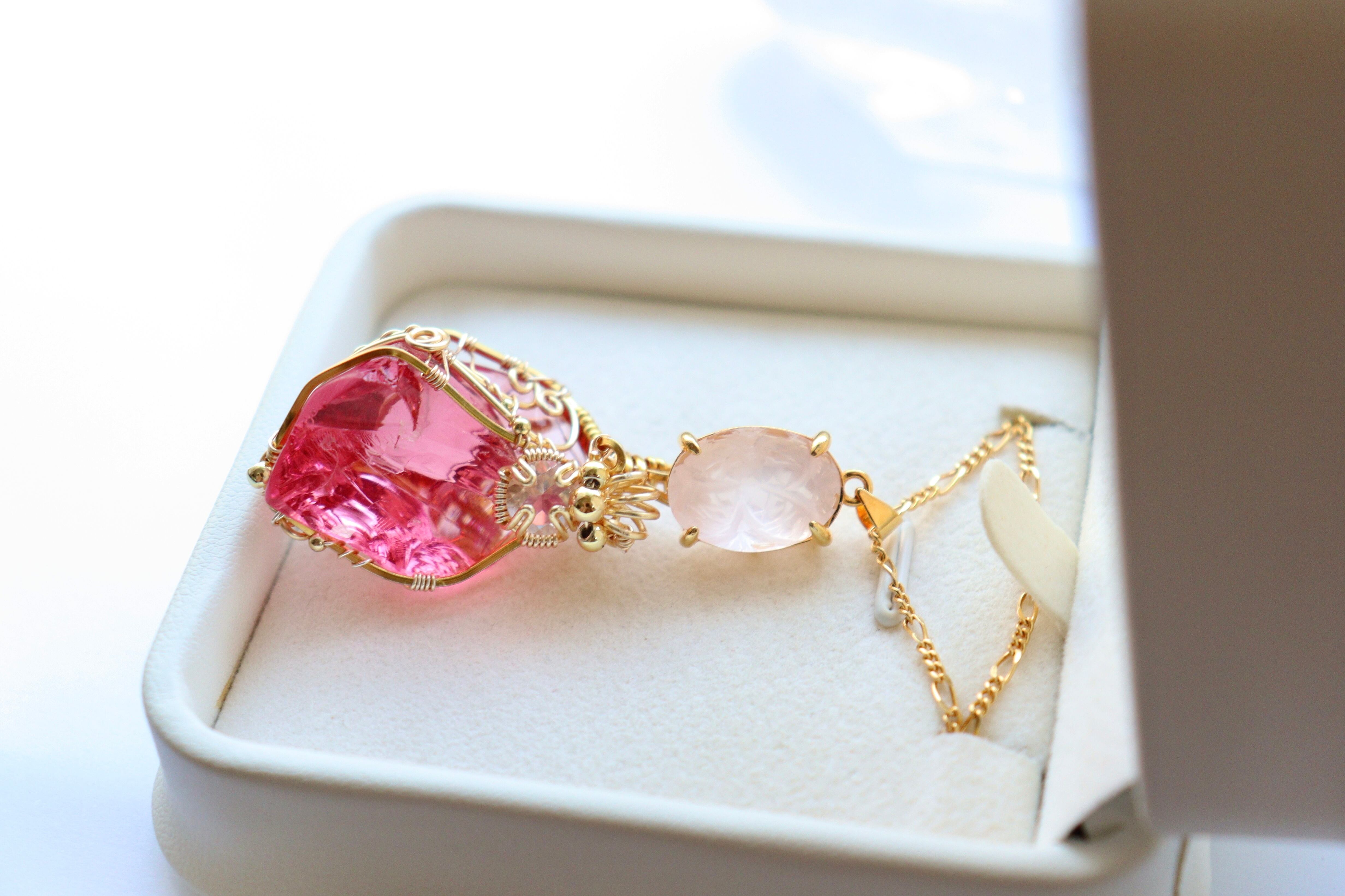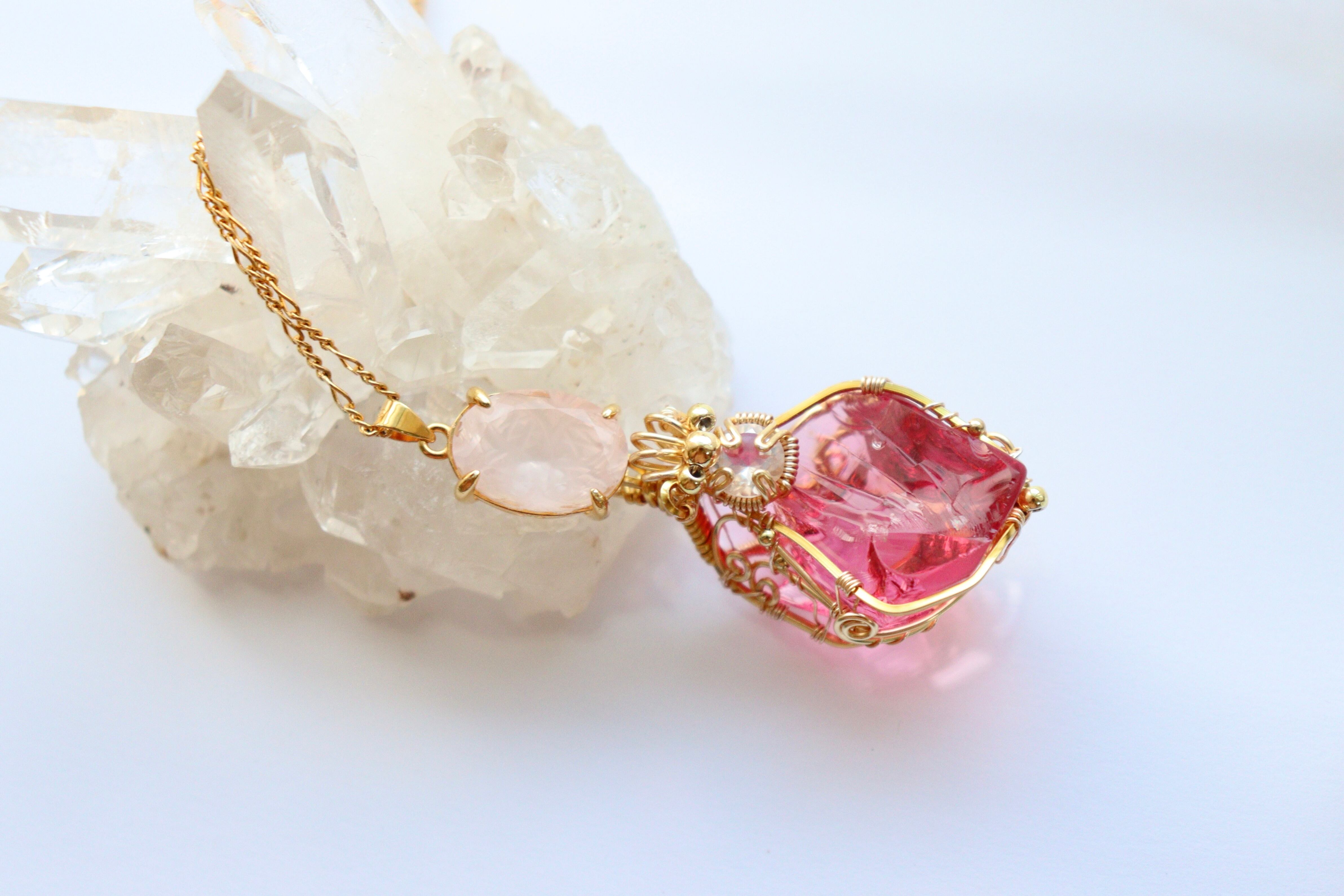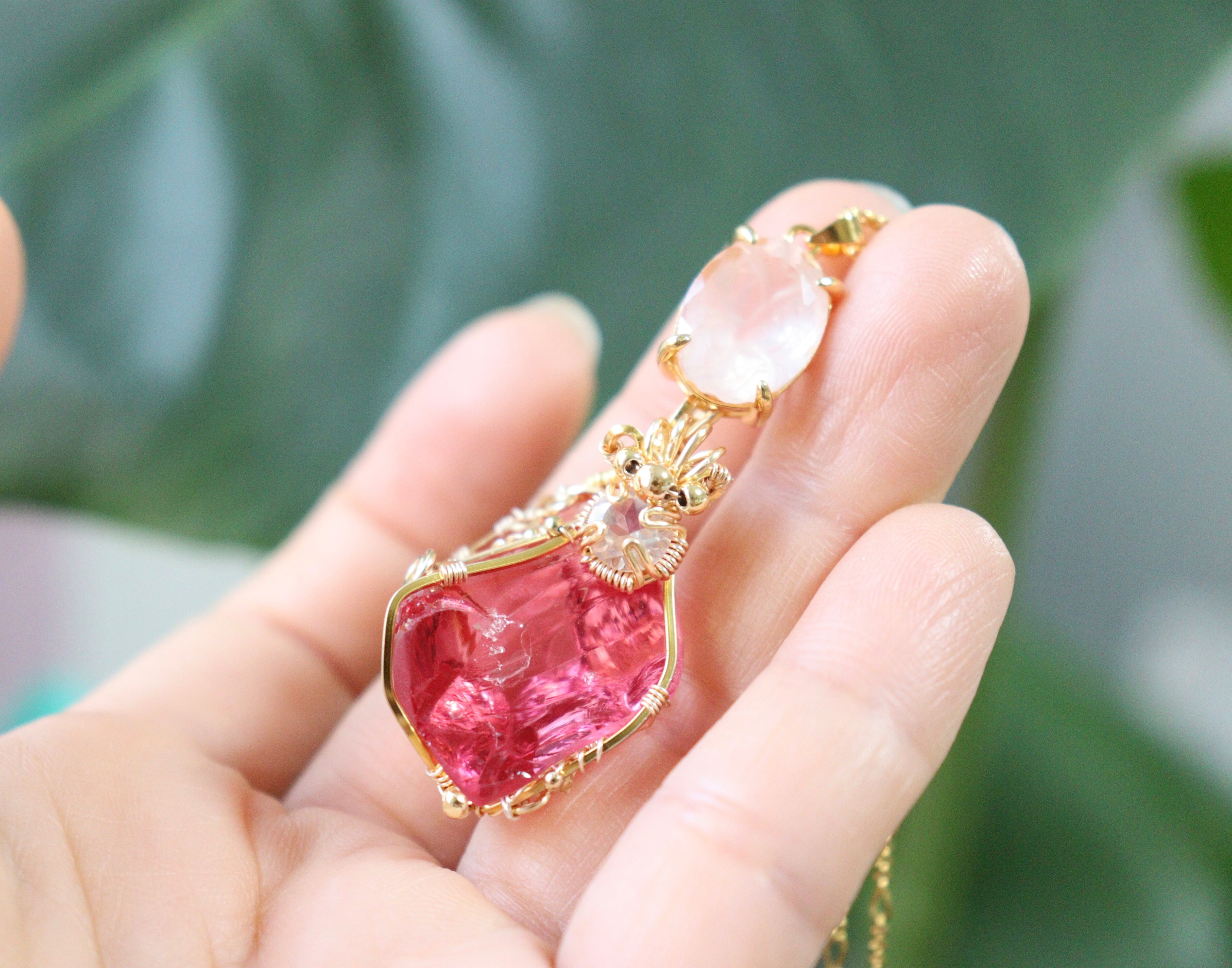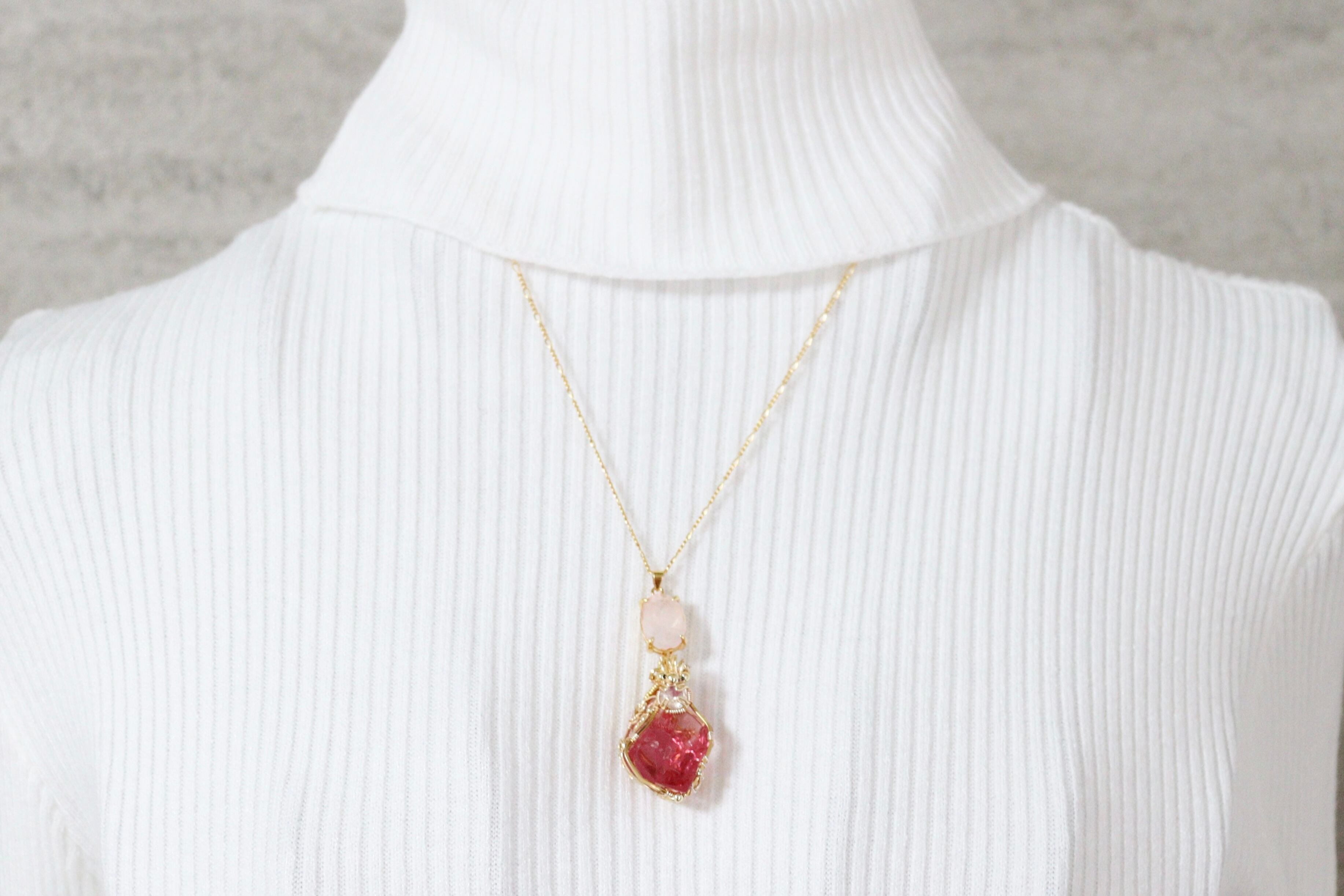 アンダラクリスタルと宝石ローズクォーツワイヤージュエリーネックレス✧10月誕生石