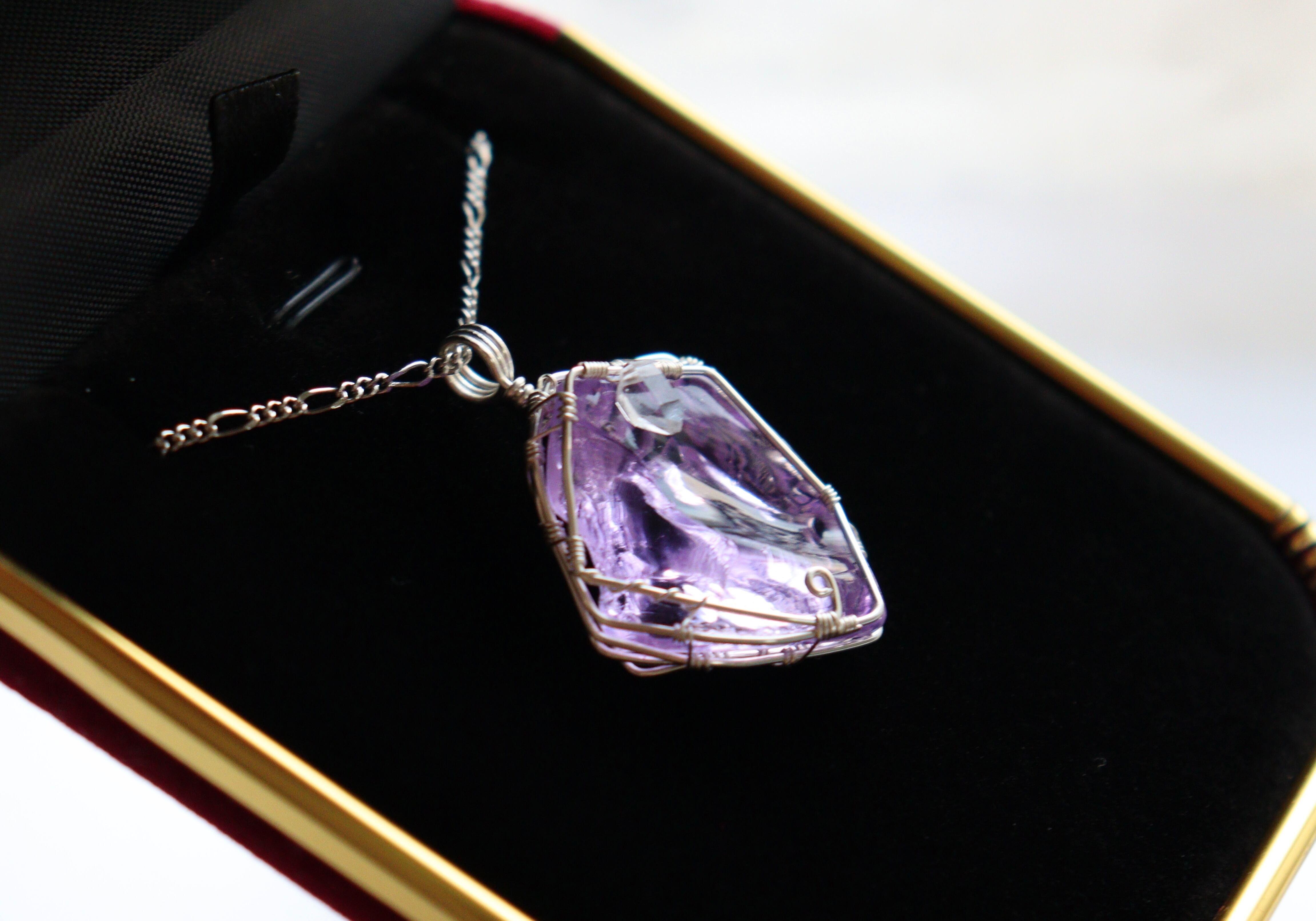 柔らかなパープルピンクのアンダラクリスタルを、ワイヤーワークでネックレスにお仕立てしました。