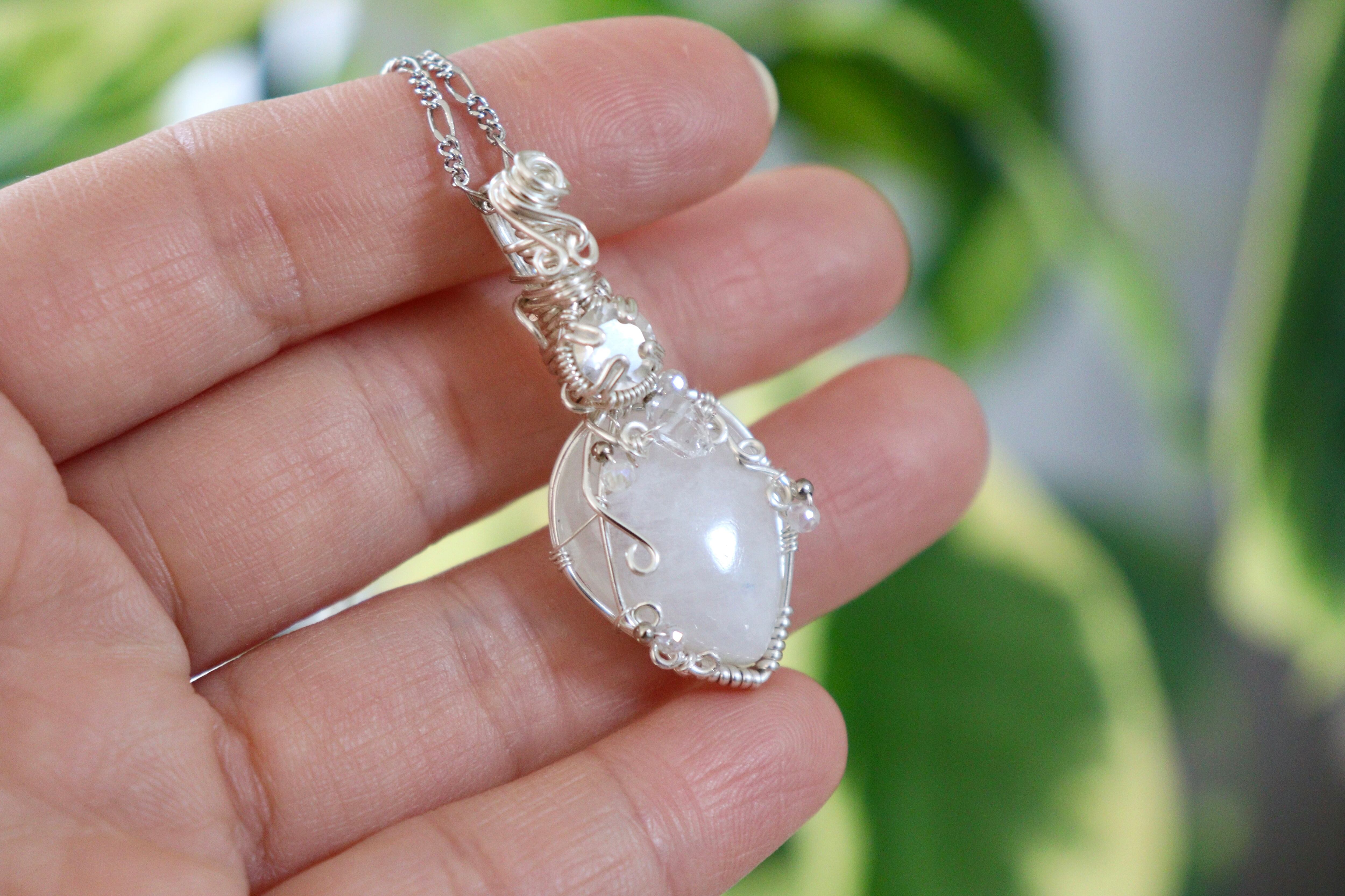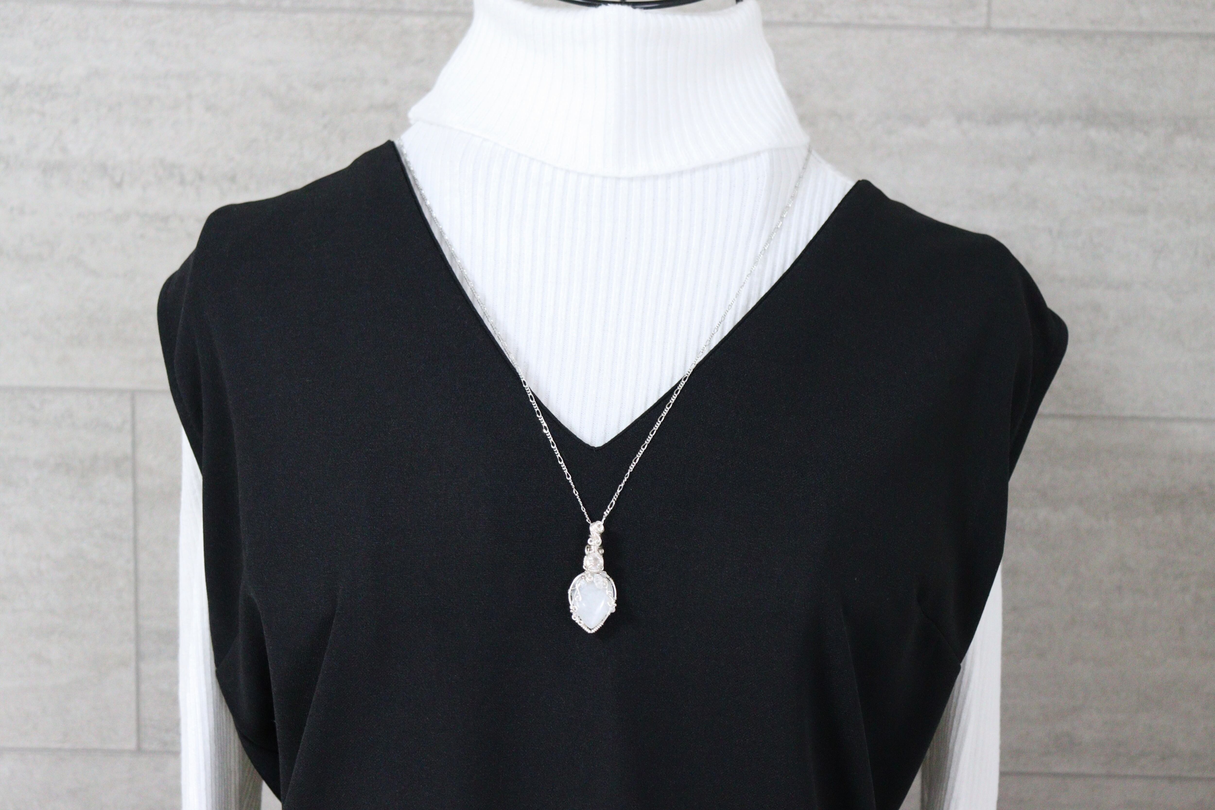 神秘的なブルーシラーが美しい、ブルームーンストーンを使用してワイヤージュエリーネックレスに仕立てました。