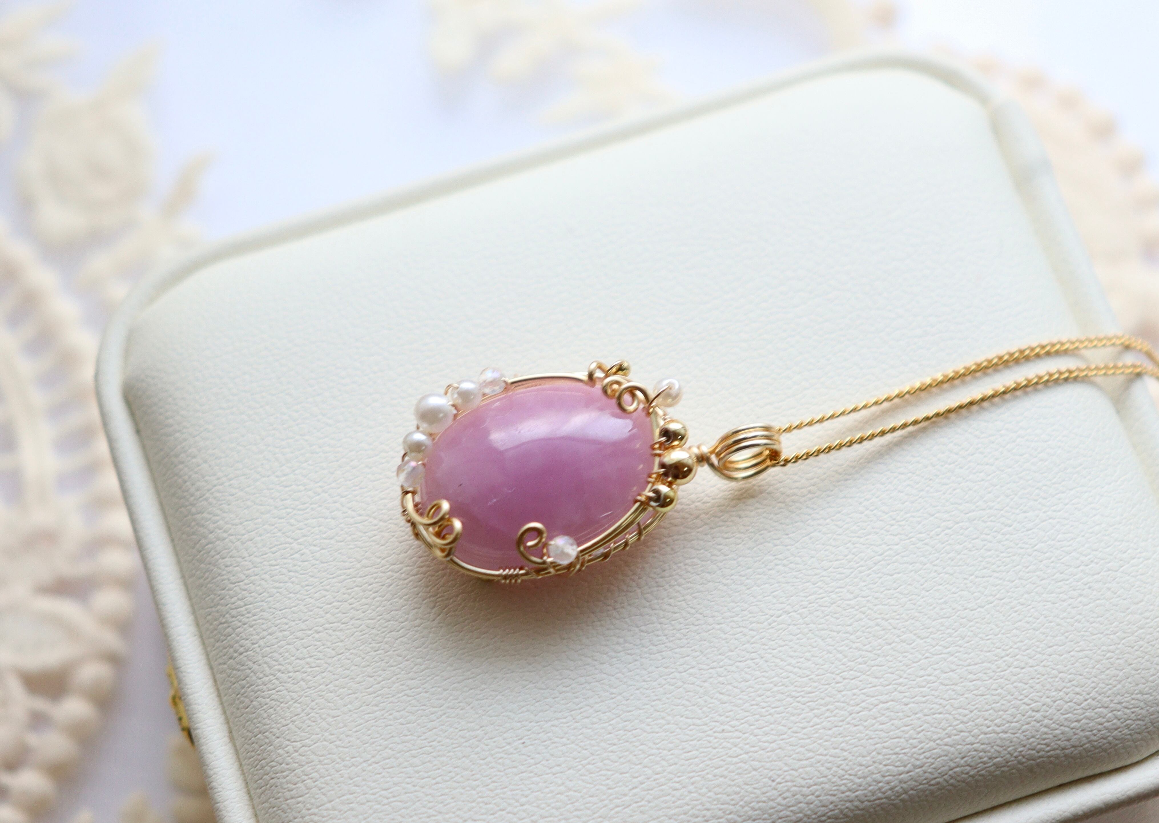 やわらかなライラックピンクが美しい天然石クンツァイトを使用し、ワイヤージュエリーネックレスにお仕立て致しました。