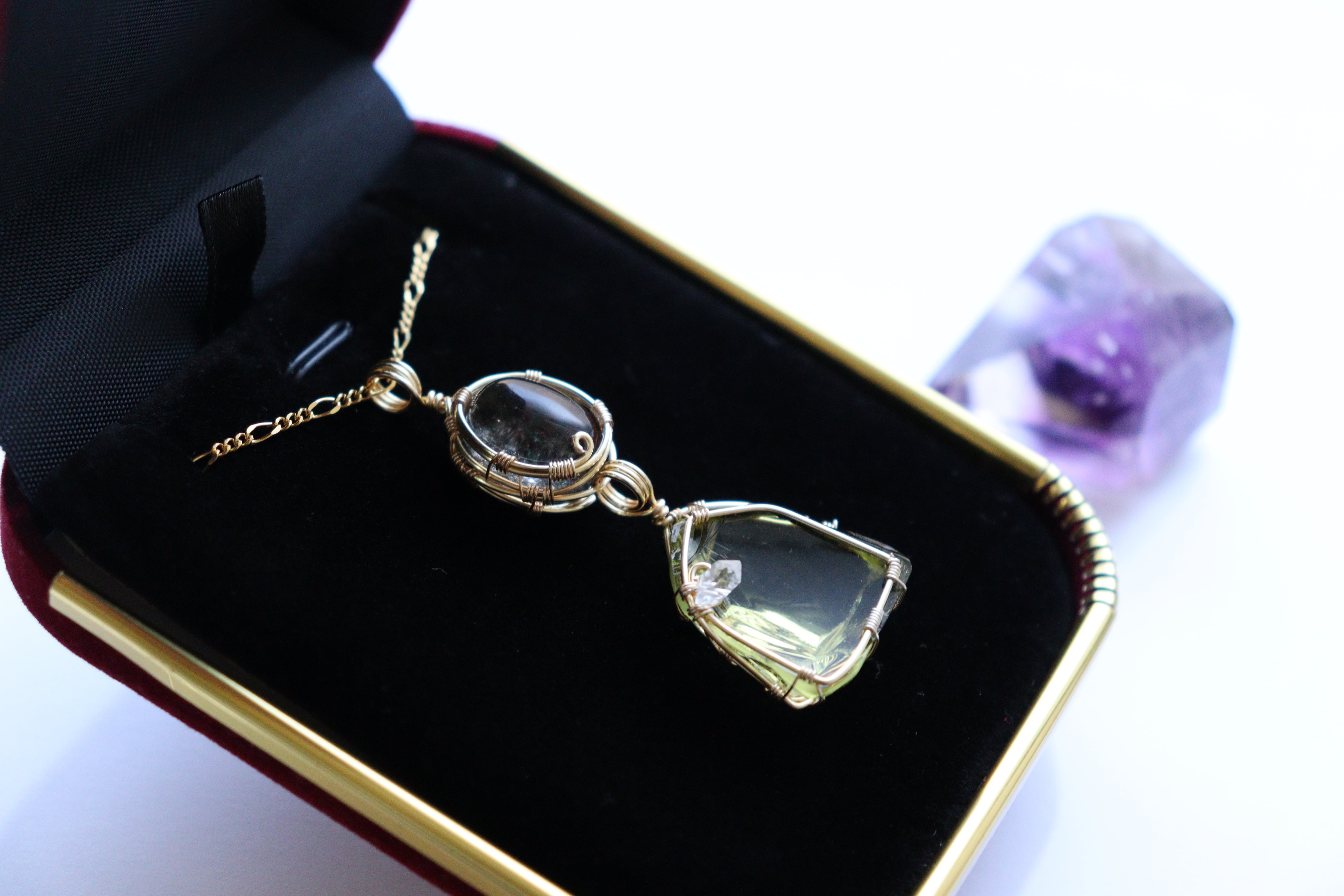 優しいオリーブカラーのアンダラクリスタルと、ガーデンクォーツを使用して、ワイヤージュエリーネックレスにお仕立てしました⟡.·